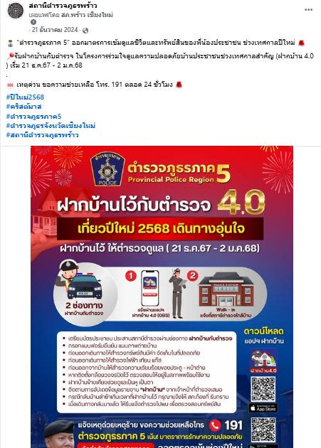 รับฝากบ้านกับตำรวจ ในโครงการร่วมใจดูแลความปลอดภัยบ้านประชาชนช่วงเทศกาลสำคัญ (ฝากบ้าน 4.0 ) เริ่ม 21 ธ.ค.67 – 2 ม.ค.68