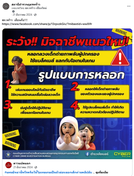 รูปแบบการหลอกลวง เตือนผู้ปกครอง โปรดสังเกต และดูแลบุตรหลานของท่าน