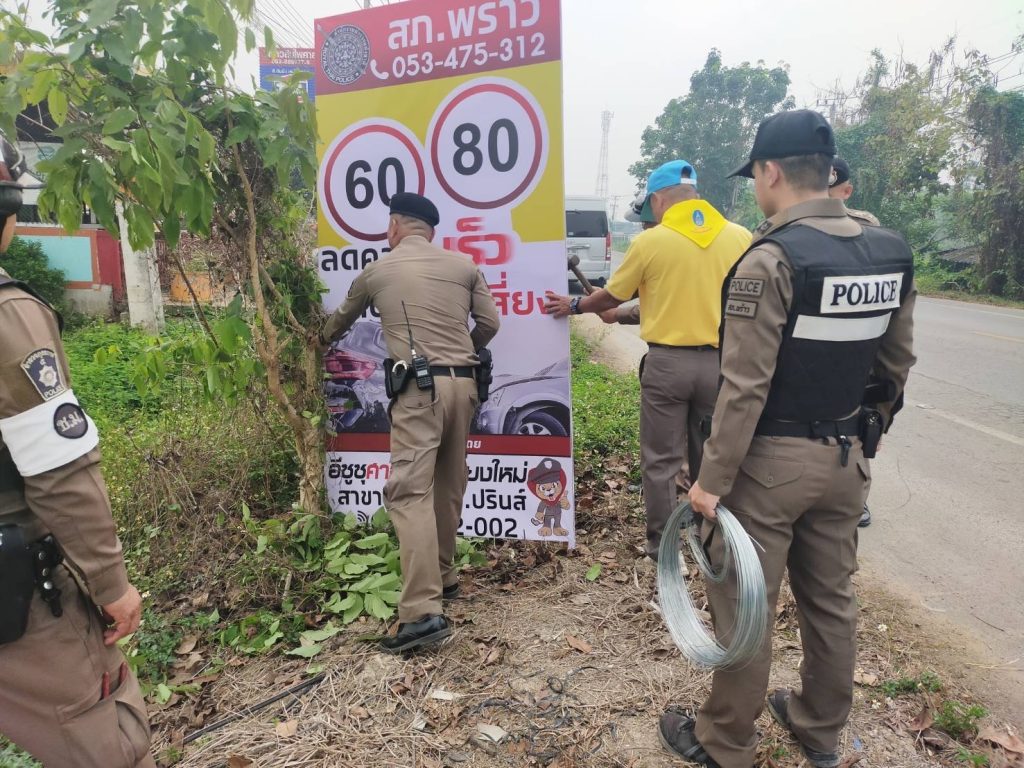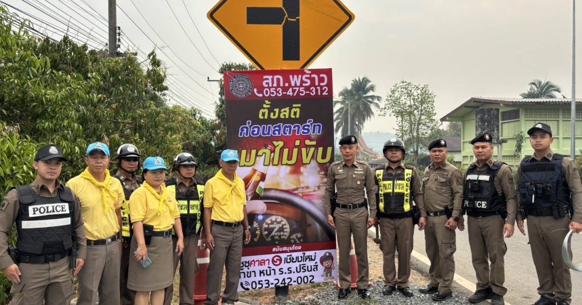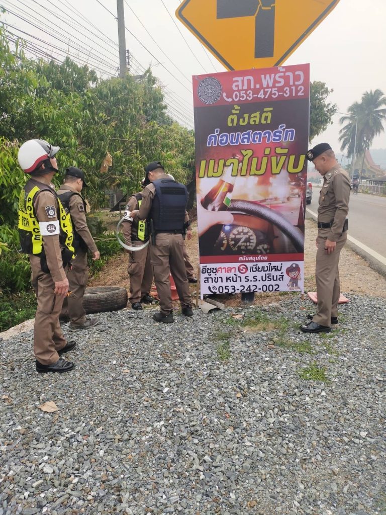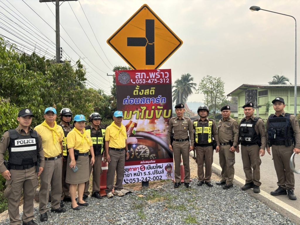 วันที่ 10 เม.ย.2568 เวลา 09.00 น. พ.ต.อ.สหพร เอียการนา ผกก.สภ.พร้าว สั่งการให้ พ.ต.ท.อำนาจ ธรรมสร รอง ผกก. ป., พ.ต.ท.ชานนทสถิตย์ วราสงวนศิลป์ สว.อก.ฯ, พร้อม 20,201/ชุด จิตอาสา/ชุด จราจร/นสต.ฝึกงาน ร่วมติดตั้งป้ายเตือน การใช้รถใช้ถนน การปฏิบัติตามกฎหมายจราจร ถนนสายพร้าว – ปิงโค้ง, จุดบริการประชาชน, หน้าที่ว่าการอำเภอพร้าว และเขตพื้นที่รับผิดชอบ ถนนเชียงใหม่ – พร้าว