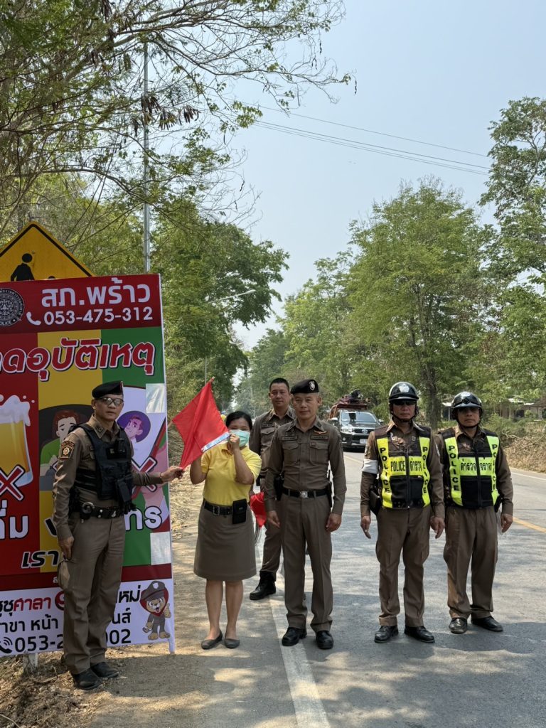 เวลา 09.00 น. สถานีตำรวจภูธรพร้าว โดย พ.ต.อ.สหพร เอียการนา ผกก.สภ.พร้าวฯ ,พ.ต.ท.อำนาจ ธรรมสร รอง ผกก ป.ฯ ,พ.ต.ท.ชานนทสถิตย์ วราสงวนศิลป์ สว.อก.ฯ ,พ.ต.ต.ประดิษฐ์ ปิยะจันทร์ สวป.ฯ ได้นำข้าราชการตำรวจสถานีตำรวจภูธรพร้าว , เจ้าพนักงานจราจร ,ชุดจิตอาสาสถานีตำรวจภูธรพร้าว , ร่วมกับนายกมล เรือนแก้ว นายกองค์การบริหารส่วนตำบลแม่แวน , นายอนุพนธ์ เกษธรรม หัวหน้าหมวดทางหลวงอำเภอพร้าว , นายมานะ บุญสุวรรณ กำนันตำบลแม่แวน และหน่วยงานที่เกี่ยวข้อง ร่วมติดป้ายแจ้งเตือน ,ธงแดงแจ้งเตือน และติดตั้งสัญญาณไฟเตือน พร้อมการปรับปรุงภูมิทัศน์เพิ่มทัศนวิสัยในการมองเห็นเพื่อกระตุ้นเตือนให้ผู้ใช้รถใช้ถนนได้เกิดความระมัดระวังในการขับขี่เพื่อป้องกันและลดอุบัติเหตุทางถนนให้กับผู้ใช้รถใช้ถนน ณ บริเวณจุดที่มีการเกิดอุบัติเหตุบ่อยครั้ง