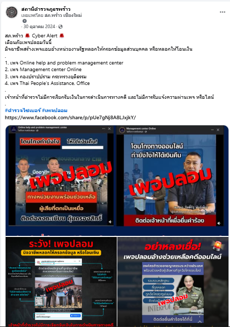 สภ.พร้าว Cyber Alert เตือนภัยเพจปลอมวันนี้ มิจฉาชีพสร้างเพจแอบอ้างหน่วยงานรัฐหลอกให้กรอกข้อมูลส่วนบุ