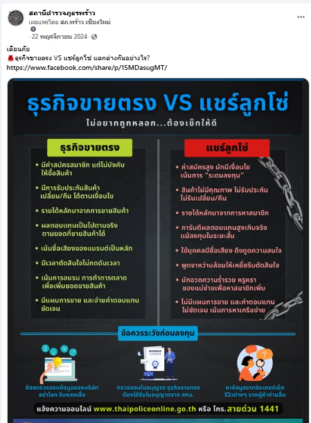เตือนภัย ธุรกิจขายตรง VS แชร์ลูกโซ่ แตกต่างกันอย่างไร? https://www.facebook.com/share/p/164H8oqkJN